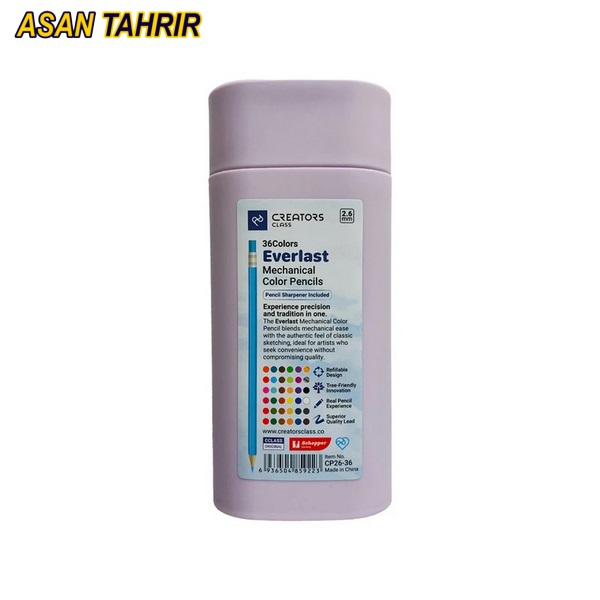 مداد رنگی اتودی یا فشاری 36 رنگ کریتور کلاس محصول جدید شرکت سی کلاس میباشد که حالت مکانیکال دارد و دارای ضخامت نوشتار یا مغزی 2.6 میلی متر با جعبه استوانه ای میباشد.مغزی این مدادرنگی قابلیت تعویض و شارژ مجدد دارد و در بسته بندی آن یک تراش جهت تیز کردن نوک هم موجود میباشد. مداد رنگی مکانیکال Everlast ترکیبی از دقت و سنت در یک محصول به همراه نوآوری و اصالت در طراحی مداد رنگی میباشد. اگر به دنبال تجربه ای بی نظیر از طراحی و رنگ آمیزی هستید مداد رنگی فشاری Everlast انتخابی ایده آل برای شماست. از ویژگی های برجسته این محصول میتوان به قابلیت شارژ مجدد مغزی که امکان استفاده طولانی مدت را فراهم میکند و دوستداری با طبیعت که با نوآوری در طراحی نیاز به قطع درختان برای تولید این مداد رنگی وجود ندارد.این محصول با نوک با کیفیت و روان تجربه ای مشابه مداد واقعی دارد و با داشتن مغزی 2.6 میلی متری ماندگاری بالا و رنگدهی عالی را تضمین میکند.تراش همراه این محصول برای تنظیم نوک و تجربه ای حرفه ای تر در طراحی را ایجاد میکند ویژگیها پخش نشدن رنگ قابلیت تراش آسان موارد استفاده طراحی فرم سطح مقطع شش ضلعی درجه سختی نوک HB جنس جعبه پلاستیکی